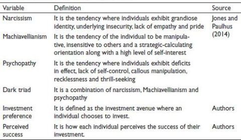 These personality traits (variables) are referred to as ‘dark’ because of their malicious and mean qualities exhibiting cruelty and manipulation. Very high dark triad composite scores indicate that the person has artificially magnified self-views (narcissism), is capable of manipulation to meet their goals (Machiavellianism), and finally, lacks empathy or remorse (psychopathy). If an investor exhibits traces of a dark side, hypothetically he or she should favour a rational decision. Existing literature on decision-making suggests the same which is discussed in the following sections.