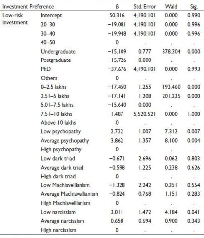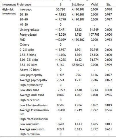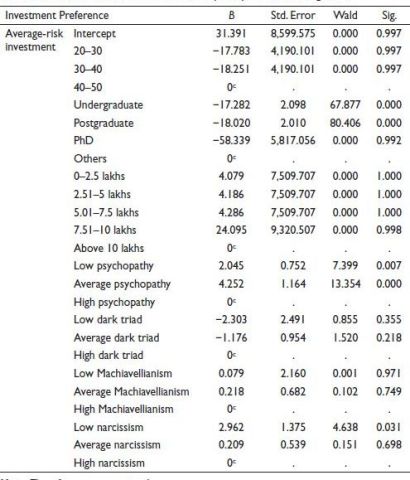 Individuals who are characterized by low psychopathy and average psychopathy prefer to invest in average-risk investments, 2.045 times and 4.252 times, respectively, than other investments. It can be further noted that as the psychopathy level of investors increases, investors become more risk-takers. Low narcissism individuals prefer to invest 2.96 times more in average-risk investments than other investments. Another level of narcissism, Machiavellianism and dark triad was found to have no significant impact on preference to invest in average-risk investments.