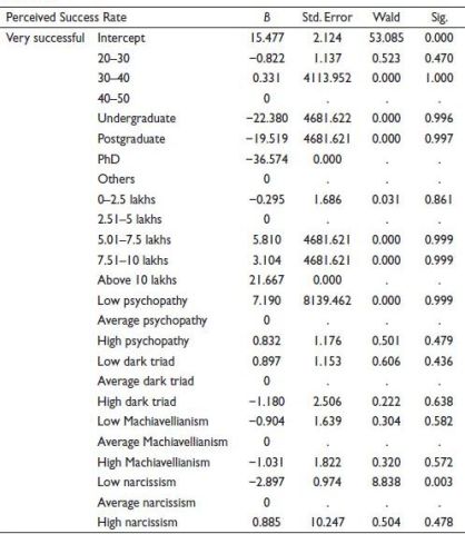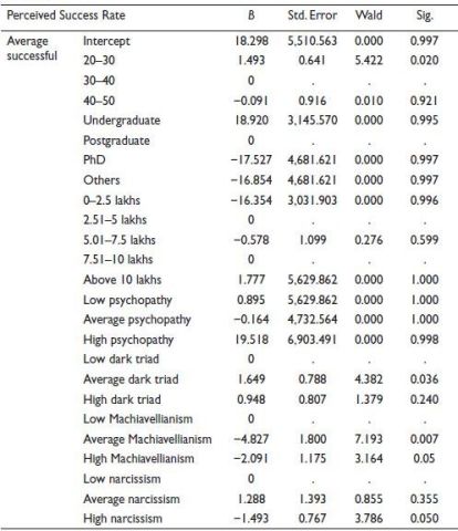 Multinomial logistic regression was applied by considering the dark triad, age, education and annual income as the independent variable and perceived success rate as the dependent variable. Based on how individual investors perceive their success in investments, they are classified into unsuccessful, average successful and very successful.