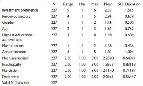 Table 2 shows the descriptive statistics of dark triads, investment preference and perceived success, that were computed. Subsequently, multinomial regression was applied and implemented. Multinomial regression analysis is appropriate in the case when numerous dependent variables are in categorical data and a single predictor variable (Bayaga, 2010). Hence, it is an apt method of analysis. Table 2 also shows the total number of responses included in this study (N = 227). Machiavellianism, psychopathy, narcissism and dark triad are the categorical data. Table 3 shows different levels of classification of personality for each category.