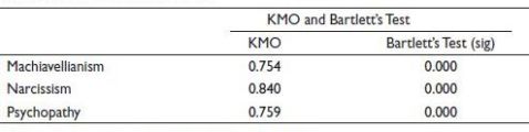 Table 5 shows the Kaiser–Meyer–Olkin Measure (KMO) and Bartlett’s Test of sphericity statistics. KMO is a test for sample adequacy, which determines whether the sample is adequate to perform factor analysis. KMO is greater than 0.7 for all three traits. Bartlett’s Test of sphericity checks for normality of the multiple variables and examines if the correlation forms an identity matrix. Since Bartlett’s Test is significant, factor analysis could be performed.
