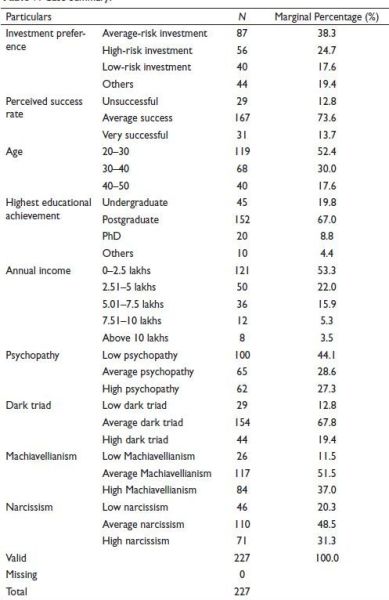 Multinomial logistic regression was applied by considering the dark triad, age, education and annual income as independent variables and investment preference as the dependent variable. Table 7 shows the case summary of the variables and data. This also shows the number of respondents in each category along with their total percentages.