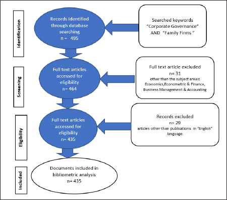 The study has followed the PRISMA (Preferred Reporting Items for Systematic Reviews and Meta-Analyses) guidelines as proposed by Moher et al. (2009) to extract the relevant studies from the Scopus database (Figure 1). In the first stage, only published research articles were extracted from the Scopus database using ‘corporate governance’ and ‘Family Firm’ as the keywords, and 495 research articles were identified at this stage. In the second stage, articles published in the subject domains, that is, Business Management, Accounting, Finance, Economics and Econometric Finance were retained, which limits the number to 464. Thereafter 29 research papers published in other than the English language were also excluded and finally 435 research articles were considered for further research.