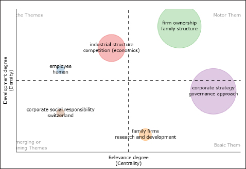 et al., 2023). The quadrant of upper right is depicted for motor themes contains ‘family structure’ and ‘firm ownership’. Motor themes are considered to be well-developed and also crucial for structuring the research field. The lower left quadrant is devoted to the emerging concept which is ‘corporate social responsibility’. But the influence of CSR on the evolution of the family firm notion is not very significant. The lower right quadrant reveals that—‘corporate strategy’ and ‘governance approach’ are the fundamental concepts in the context of family-owned enterprises but need further validation. In the upper left quadrant, niche and well-developed issues such as ‘industrial structure’ and ‘market competition’ can be seen (Figure 7).