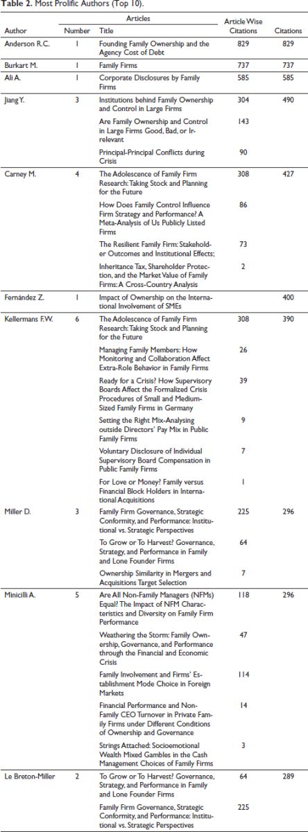 Out of his six publications, Kellerman (Gedajlovic et al., 2012) received the most citations (307 citations) for his review work titled ‘The Adolescence of Family Business Research: Taking Stock and Preparing for the Future’ and concluded that family firms devote more time and effort to preserve the socioeconomic wealth of the firm as compared to non-family firms. The second most cited work in this area is Burkart et al. (2003). In this study, the authors explained the repercussions of the agency’s two problems, that is, (between majority and minority shareholders), and argued that the legal protections offered to minority shareholders play a significant role in deciding the role of family members in the firm’s management. (Ali et al., 2007) in their study titled ‘Corporate Disclosure by Family Firms’ analysed the disclosure practices of family firms and found that the family firms have fewer forecasting errors, bid-ask spreads and lower analysts’ dispersion as compared to the non-family firms. The fourth most cited work with 304 citations, that is, ‘Institutions behind family ownership and control in large firms’, by Peng and Jiang (2010) concluded that the corporate governance mechanisms—ownership, CEO position, pyramid structure and institutional development—have a significant impact on firm’s value. The study conducted by Fernández and Nieto (2006) have 400 citations worked on understanding the role of the family in scaling the firm to the international level and observed that family ownership has a negative effect on internalisation. The firm having corporate ownership has scaled to the international level. The study titled ‘Family Firm Governance, Strategic Conformity and Performance: Institutional vs. Strategic Perspectives’ by Miller D. & Le Breton-Miller (authors ranked 8th and 10th in most cited authors) argued that strategic conformity is more prevalent in businesses where family members serve as CEO. But this strategic conformity is found to be associated only with high return on assets not with firm value. While analysing the impact of family manager’s characteristics on firm’s performance, Minicilli A., tested the moderation effect of family dominance and noticed that non-family team diversity plays a significant role in firm performance and the family dominance (i.e., proportion of family members on board), have a positive moderating effect.