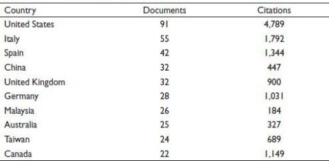 Figure 4 presents the top 10 countries where studies on corporate governance practices of family-based firms have been conducted. It may be observed from the study that the majority of the research works have been concentrated within the realm of highly developed countries such as the United States (N = 91), Italy (N = 55), Spain (N = 42), United Kingdom (N = 32), Germany (N = 28), Australia (N = 25) and Taiwan (N = 24). Only 3 developing countries make it into the top 10, and those are China (N = 32), Malaysia (N = 26) and Canada (N = 22). In terms of citations, Table 3, the studies conducted in the USA have the highest number of citations (4,789) followed by Italy (1,792), Spain (1,344) and Canada (1,149). China and the U.K. have only 32 publications but not enough to make a significant impact in terms of citations compared to the publications of Germany and Canada.