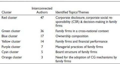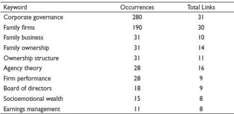 For finding the most prominent themes, keywords networking diagram and thematic mapping methods were used. Keywords networking analysis identifies that ‘innovation’, ‘product market competition’, ‘corporate social responsibility’, ‘financial crisis’ and ‘socio-economic wealth’ are less explored concepts int he context of family firm literature. So, these areas can be further explored to have a better understanding of family firms’ behaviour and to give new directions for future research. Thematic analysis suggests that corporate strategy and governance approach are the basic themes related to the field but are still unexplored. It also shows that industrial structure and competition are well-developed themes, but more efforts are needed to establish their link with the family businesses. The most significant authors and their collaborative efforts in the field of family governance are displayed by the bibliographic co-authorship network. This network identifies ‘corporate disclosure’, ‘corporate social responsibility’, ‘decision-making power’, ‘managerial behaviour’, ‘ownership composition’, ‘board structure’ and ‘governance mechanisms’ in family firms as the core themes in the existing studies. Family-owned firms are more engaged in CSR activities and more financial transparency due to their reputation concern. In addition to resolving disputes and fostering harmony among the family board, an effective governance framework is substantial for long-term survival in the market.