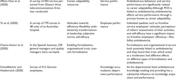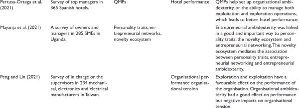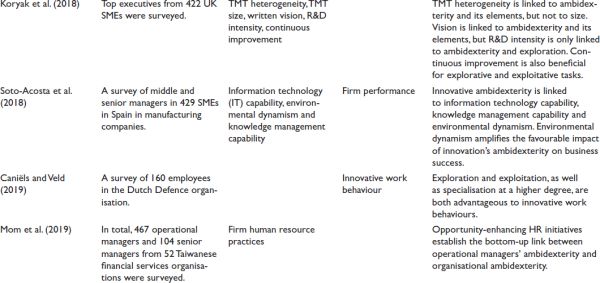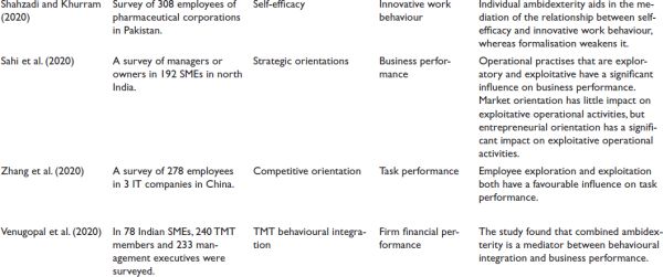 As a result, Indian small and medium enterprises (SMEs) follow strategic orientations to strengthen operational ambidexterity (Sahi et al., 2020). Furthermore, Dezi et al. (2019) and Soto-Acosta et al. (2018) consider knowledge management and the external embeddedness orientation of firms to be important contributors to ambidexterity, exploitative innovation and exploratory innovation. They also found that, when it comes to the environment, environmental dynamism and innovative ambidexterity are both good things. Recent studies have indicated that employee attitude and behaviour, manager leadership style and top management team (TMT) characteristics positively affect organisational ambidexterity. Zhang et al. (2019) have proved that handling work stress and building trust are two antecedents that influence the process and capabilities of individual ambidexterity.
