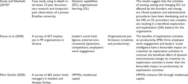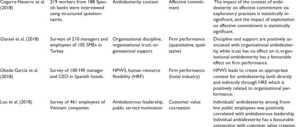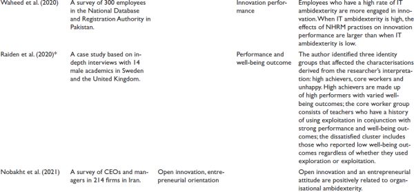 Many empirical studies have investigated organisational ambidexterity in several organisations across different countries. These studies demonstrate a favourable impact of organisational ambidexterity on organisational performance, individual performance, product innovation and innovative work behaviour. As an organisation becomes more ambidextrous, it will achieve better results, so ambidexterity is a crucial characteristic of organisations that attain high performance (Chams-Anturi et al., 2019; Fu et al., 2015). Additionally, an organisation’s ambidexterity can mediate the connection between organisational trust and organisational performance and help reduce organisational tension (Peng & Lin, 2021). Furthermore, Katou et al.’s (2020) study defined performance as a synthesis of the following two distinct constructs: productivity and creativity. According to research, exploration tasks are independently linked to creativity, whereas exploitation tasks appear to be more closely related to productivity. Based on the findings of Sahi et al. (2020), Indian SME enterprises are engaging in both exploratory and exploitatory activities, which, in turn, result in better business performance. Additionally, individual ambidexterity improves performance at different levels within an organisation, namely at the levels of the team and department (Schnellbächer et al., 2019). In Zhang et al.’s (2020) research, employees’ exploitation and exploration both contribute to their task performance. Furthermore, using HPWS is appropriate for developing ambidextrous learning abilities, which results in improved organisational performance (Úbeda-García et al., 2016, 2018). Additionally, exploitation and exploration activities can be developed and lead to ambidexterity, and then hotel performance can be improved (Pertusa-Ortega et al., 2021).