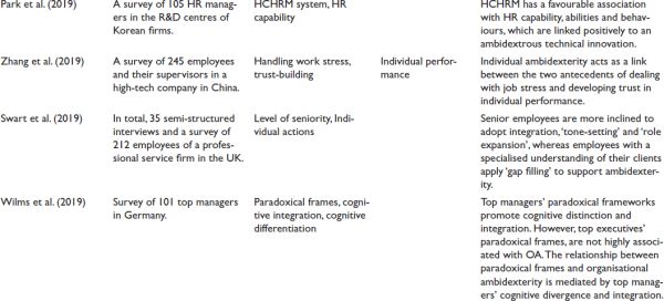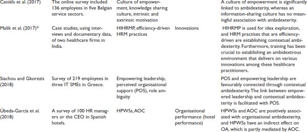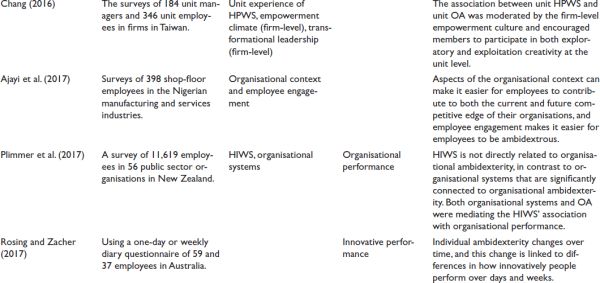 Additionally, previous studies have emphasised that the high-involvement work system (HIWS) enhances ambidexterity. For example, according to Malik et al.’s (2019) data, Semicon employed both efficiency-oriented and empowerment-oriented HRM practises to establish an ambidextrous environment for its employees. The authors discovered that high-involvement HRM practises were used for exploring new ideas, along with efficiency-driven HRM practises, to create contextual ambidexterity (Malik et al., 2017). Additionally, Garaus et al. (2016) defined ‘an ambidextrous HRM system as a particular type of HPWS that facilitates the continuous integration of exploration and exploitation in the pursuit of increased flexibility and efficiency’. Further, they said that HRM systems with ambidextrous capabilities permit a firm to handle the opposing tasks of exploration and exploitation within the context of a ‘common frame of reference’ and the capability to coordinate knowledge. Furthermore, numerous studies have investigated whether organisational discipline, support, trust and context facilitate ambidexterity in organisations (Chams-Anturi et al., 2019; Günsel et al., 2018). Ajayi et al. (2017) indicate that the ‘organisational context elements (knowledge sharing, adhocracy, clan culture and organic structure)’ will reinforce employees’ capability to simultaneously add to their organisations’ competitive advantage in the present and future. Schnellbächer et al.’s 2019 findings indicate that organisational architecture and organisational context promote ambidexterity in individuals.