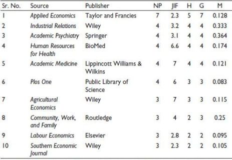 Note: This table lists the top 10 journals with the name of publisher, the number of publications (NP), the journal impact factor (JIF) and the impact indices (h-index, g-index, m-index) as per the Scopus database.