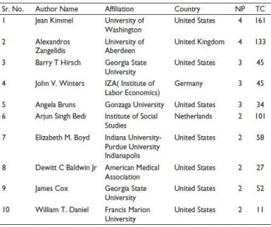 Table 4 shows the top 10 documents that have made significant contributions to our topic. The paper titled ‘Wage Differentials Between the Public and the Private Sectors: Evidence from an Economy in Transition”, written by Arjun Singh Bedi and Vera Adamchik in 2000, had the highest number of citations. Jean Kimmel and Alexandros Zangelidis are two authors who wrote three documents, each with other authors, and received good citation counts. Table 4 shows Jean Kimmel as the most contributing and influential author in this field.