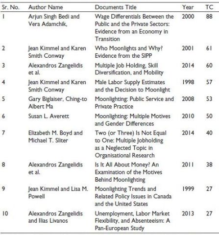 In bibliometric analysis, we found that Applied Economics and Industrial Relations were the top journals in our lists. Jean Kimmel contributed maximum literature on moonlighting. The University of Aberdeen had the most influential affiliation, and the United Kingdom and the United States were highly producing countries.