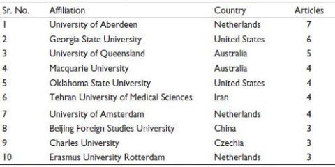 Note: This table lists the top 10 affiliations with country and the number of publications.