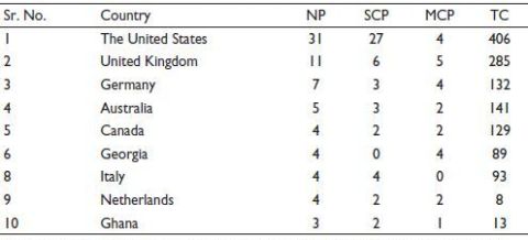 Note: This table lists the top 10 countries with the high number of publications (NP) and their single-country publications (SCP), multiple-country publications (MCP) and total citations (TC).