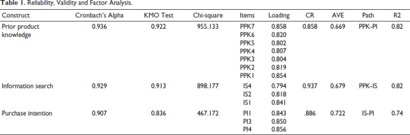 The study assessed the convergent validity, average variance extracted (AVE) and composite reliability (CR) of the constructs—prior product knowledge, information search and purchase intention. Following the guidelines of Hair et al. (2013), with a cut-off value of 0.5, the AVE and CR were initially estimated. Similarly, for loading values, a threshold of 0.7 was considered acceptable. Although loadings exceeding 0.7 are preferred, loadings between 0.5 and 0.7 are deemed appropriate if the AVEs surpass 0.5 (Ramayah et al., 2018). In this study, all loading values exceeded 0.7, with AVEs greater than 0.5, indicating acceptable convergent validity (Table 1). Notably, AVE values close to or exceeding 0.7 are widely recognised in current research practices. AVE values below 0.5 imply that items explain more errors than the variation in the constructs, hence failing to meet the measurement model’s criteria. Furthermore, composite reliability, akin to Cronbach’s alpha, signifies the internal consistency of scale items (Netemeyer, 2003). According to Morgan (2005), it represents the extent of score variance captured by the overall scale score variance. In this study, the internal consistency of each item within the scales was found to be satisfactory, surpassing the threshold of 0.7 for composite reliability across all constructs, affirming the validity and reliability of the measurement model.