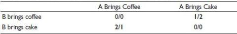 Furthermore, coordination can take place under conflict if actor A and B want to meet for a café and cake, for example, and agree that one will bring cake and one will bring café, whereby both prefer to bring café, as this is less work. We still get two equilibria.