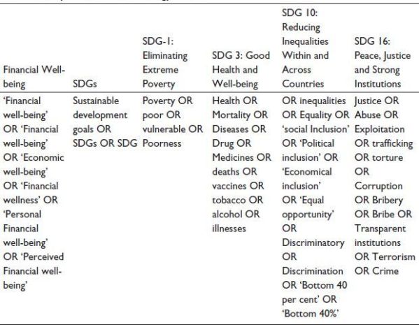 Next, this article defines the conceptual boundaries of financial well-being and SDGs by selecting only those articles that either cover SDGs directly or cover some specific goals of SDGs with financial well-being. Bashir and Qureshi (2023), Fu (2020) and Le Blanc (2015) discuss the relationship of financial well-being with poverty, inequality, health and well-being, and peace, justice and strong institutions. So, this article just tries to find out the relationship between these goals of SDGs and financial well-being.