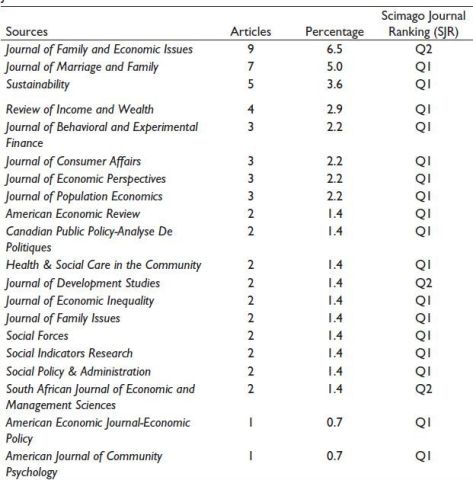 As shown in Table 2, the top 20 journals contributing to the systematic literature review (SLR) on financial well-being and SDGs are listed, with Journal of Family and Economic Issues contributing the highest number of articles.