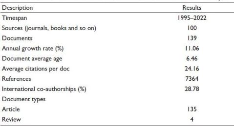 In this corpus, a total of 139 articles from 100 different sources with 7,364 references have been selected for the analysis. Wherein there are 135 research articles and 4 review articles. The annual growth rate of research in financial well-being in the context of SDGs has reached 11.06%, but there are still very few articles on financial well-being that directly discuss the SDGs. In the selected 139 articles, almost 29% of their authors are from a foreign country. From Table 3, it can be seen that the number of review articles in comparison to normal research articles is very low. So, there is a scope for future researchers to write review articles in this area.
