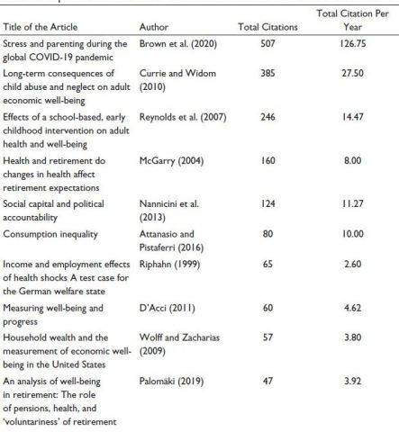 McGarry (2004) is the fourth highest-cited article globally (160 citations). It explains the importance of retirement dates in the financial well-being of an individual. Retirement date is a very crucial decision for the individual because it can affect the economic well-being for the rest of their life.