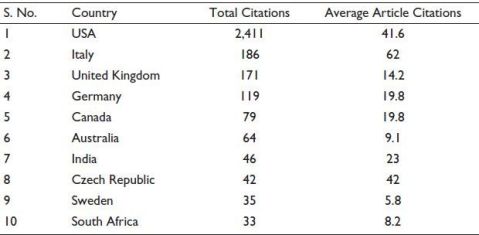 The USA, Italy, the United Kingdom and Germany are the top four countries that have contributed more than 3,000 citations, out of which the USA accounts for 2,411 citations, which is 71% of total citations. It can be observed that the USA is dominating research in this area. But on the basis of average citations per article, Italy has 62 citations per article while the USA has only 41 citations per article. Since the USA has been working in this area from the very beginning, they have the highest number of citations and number of documents in this context.