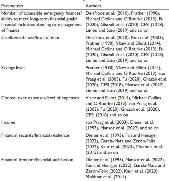 Table 7 lists the key parameters that have been used in different studies to measure financial well-being, including factors like savings levels, creditworthiness, and income.