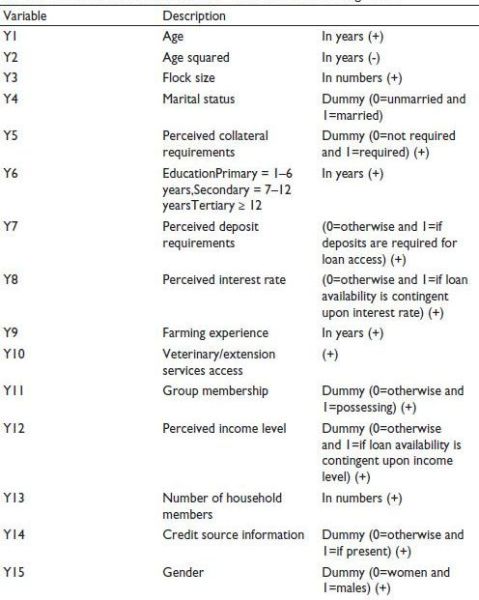 The signs in parentheses reflect a priori predictions of the direction of change in the likelihood of credit accessibility owning to a unit change in any of the model’s explanatory factors.