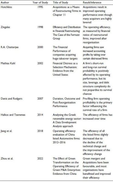 Financial restructuring has been a means to achieve better performance for financially unviable firms (Siro, 2013). It is a mechanism to rework the firm’s capital structure to enable it to be in a better financial position (Ahmed and Govind, 2018). Hotchkiss (1995), in his study titled ‘Acquisition as means of restructuring firms in Chapter 11’, surveyed 55 acquisitions and found that the firms merged with bankrupt targets significantly improved the operating performance. So, a financial initiative to improve the operating performance of the firms provided positive results. Penati and Zingales (1998) conducted a study on the Ferruzzi Group titled ‘Efficiency and Distribution in Financial Restructuring: A Case of the Ferruzzi Group’ in which they analysed the distributional and efficiency consequences of financial restructuring. The payoffs to the creditors were compared with those they would have obtained without any restructuring mechanism. It was concluded that there was distributional gain to the creditors, and the firm’s operating efficiency, as measured by the ratios, improved after reorganisation. The study also emphasised the importance of allocation of control in financial restructuring. Chatterjee et al. (1996), in his study titled ‘The Financial Performance of Companies Acquiring Huge Takeover Targets’, focused on large taken-over companies from 1977–1990 and studied their financial performance and accounting profit. The study focused on the Cumulative Abnormal Returns (CARs) of the firms and concluded that acquiring firms saw an increase in accounting profit by taking over distressed firms. It was followed by a study by Mathias Kahl in 2002, which concluded that the firm’s long-run and short-run operating performance is affected by its profitability, not size, leverage and debt structure. A summary of a few past studies is shown in Table 1.