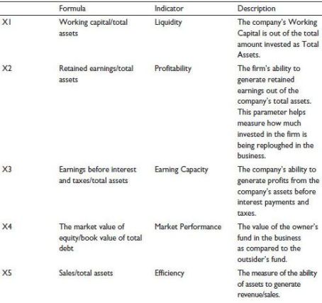 The study first tries to assess the financial performance of the firm Ellora Paper Mills Ltd using the method provided by Altman Edward in 1968. The technique, known as Altman’s z-score model, states that specific ratios have predictive power to predict a firm’s bankruptcy and financial distress. Altman suggested five ratios in his model. The ratios used in Altman’s model are shown in Table 2.