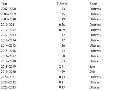 Sharma, M., & Patra, G. C. (2021). Prediction of financial distress in Indian firms using Altman Z-score model. The Journal of Contemporary Issues in Business and Government, 27, 4341–4348.
