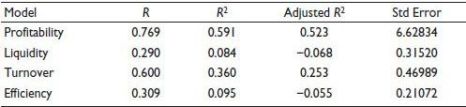 Table 5 indicates that the model coefficient of determination (adjusted R2) was 0.591, 0.084, 0.360 and 0.095 for profitability, liquidity, turnover and efficiency, respectively.