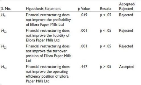 The summarised results of the study concerning the acceptance/rejection of the hypothesis are depicted in Table 6. The hypothesis statement regarding no impact of financial restructuring on liquidity, profitability, turnover and efficiency of the firm stands rejected as the findings suggest that financial restructuring does improve the liquidity (p = .001), profitability (p = .049) and turnover (p = .001) of Ellora Paper Mills Ltd. However, there is no significant effect on the firm’s operating efficiency (p = .447).