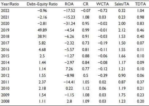 The empirical study is based on secondary data extracted through the company’s Financial Statements using the CMIE-Prowess database for The Ellora Paper Mills Limited from 2007–2008 to 2022–2023. Altman’s z-score model was used to consider the level of sickness, and the regression model was applied to the various ratios, assessing profitability, liquidity, solvency, and efficiency for hypothesis testing with the help of SPSS.